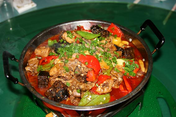 【 酸辣子炒沙蘿菇 】 當?shù)卮合募居旰?,山頭巖石壁上生長的墨綠色地菇——地衣(本地名為沙蘿菇),采集后用清水反復多沖洗幾次。再用壇子腌的酸辣椒和大蒜一起炒熟,出鍋后灑些許香蔥即成一道色、香、味俱全的地方特色小吃。