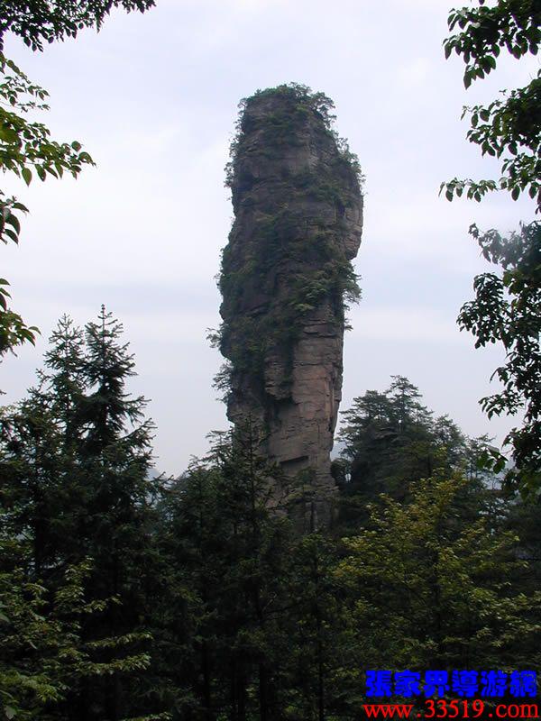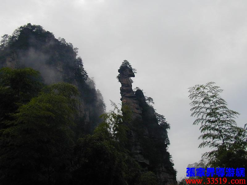 (南天一柱)現(xiàn)在我們前方幽谷峰林中有一高達(dá)200多米的孤峰,宛如擎天玉柱。上部灌木點(diǎn)綴,中部巖身赤裸,下部樹(shù)木遮掩,峰體渾圓、偉岸,因立南天門下而得名?!?/p>