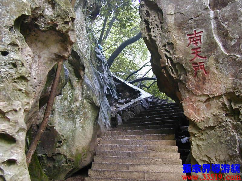 (南天門)(前行20米)現(xiàn)請(qǐng)大家抑頭望,可見(jiàn)一洞門,此門高約30米、寬4米左右,由游道兩側(cè)的兩座石峰斜傾拱峙而成。門右邊不遠(yuǎn)處一峰高約20米,峰頂如人頭,有臉有面,似把門將軍。