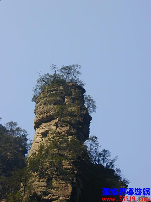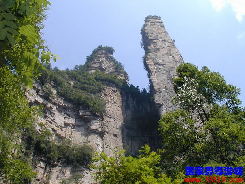 (金鞭巖、神鷹護(hù)鞭)如果要問(wèn)張家界國(guó)家森林公園的標(biāo)志景點(diǎn),答案是現(xiàn)成的:金鞭巖。早在清代中期,一些文人就把張家界的峰林及百丈峽列入“永定八景”。其一叫“危峽啼猿”;其二叫“層巖涌塔”:“縣西二十里青崖山,其前五山并立,層峙如浮圖。中一峰更峻拔,上插宵漢,晴輝雪積,最擅奇觀。”這里說(shuō)的“其中一峰”,指的金鞭巖。八大景點(diǎn)張家界占其二,可見(jiàn)先人是有眼力的。金鞭巖相對(duì)高度380多米,拔地而起,直插云霄,無(wú)論你遠(yuǎn)看近看,正看側(cè)看,都是一根刺破青天的長(zhǎng)鞭!在金鞭巖左側(cè)的那座巖峰,大家看多像一只兇猛的老鷹,勾嘴瞪眼,雙翅略展,時(shí)刻警覺(jué)地守護(hù)著金鞭,人稱“神鷹護(hù)鞭”。