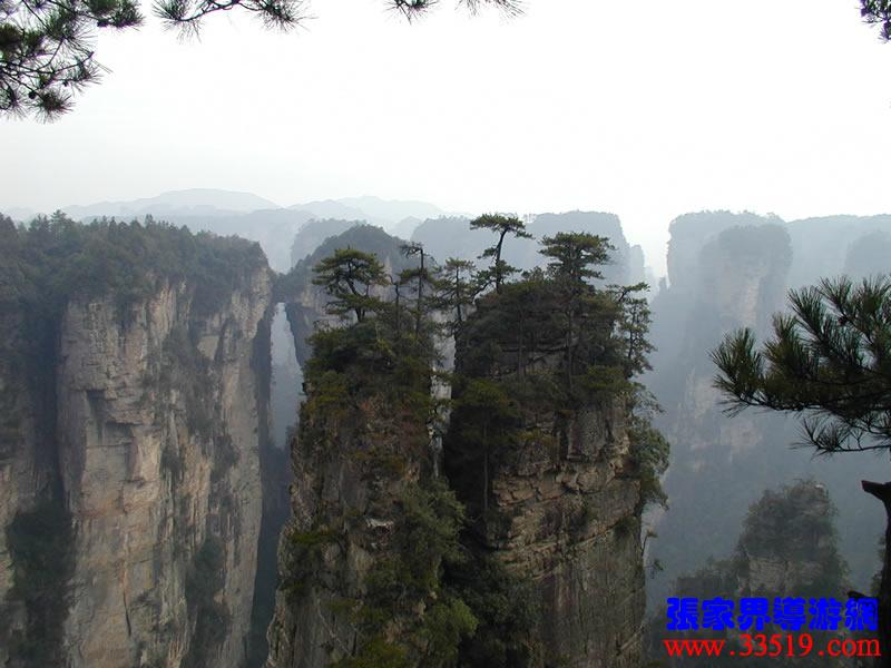 (天下第一橋)更多天下第一橋圖片>>>> 那就是“天下第一橋”。你們看,兩座山峰被一條長廊連在一起,形成天然橋洞,平時(shí)吞云吐霧,氣勢壯觀雄奇。橋面寬約兩米,長20余米,絕對高度357米。橋上蒼松挺拔,橋邊古藤垂掛,橋下深不可測。走在橋上,只見霧氣蒸騰,松濤呼嘯,石橋好像也顫顫悠悠,晃晃搖搖似的,令人驚心動魄。這里是張家界風(fēng)景一絕,是大自然的一個(gè)奇跡。
