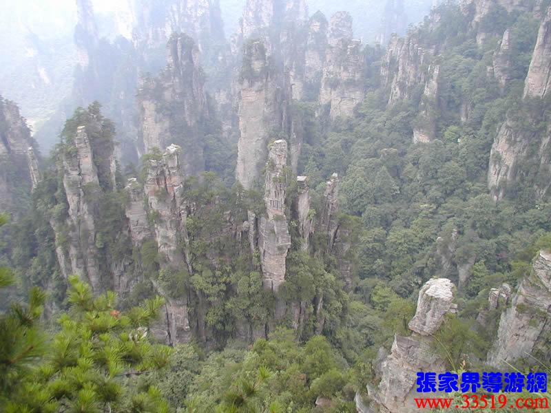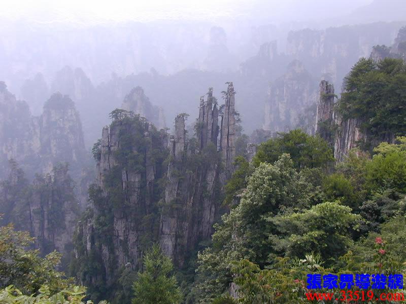 (大觀臺)這就是大觀臺。極目遠(yuǎn)眺,千百座奇峰盡收眼底。一位詩人說,武陵源的砂巖峰林是一步一觀景,千步千造型,一山有四季,十步不同天。專家測算出武陵源石峰有3103座。一如一位高超的雕塑大師,模擬宇宙萬物,無不形狀逼真,維妙維肖,栩栩如生,呼之欲動。有的如海螺出水,有的如金龜銜日,有的如蓮花盛開,有的如天橋橫空,有的如長槍刺天,有的如寶塔聳立,有的如老人采藥,有的如玉女梳妝,有的如將軍出征,有的如戰(zhàn)馬長嘯,有的如情人幽會,有的如夫妻相擁,有的如仙女散花,有的如村姑守望.....有的孤峰獨(dú)秀,有的直插云霄,有的婷婷玉立,有的威武勇猛,有的小巧玲瓏,有的大氣磅礴。進(jìn)入武陵源,但見一片峰的森林,峰的世界,峰的海洋。挺拔、奇秀、集中、原始、粗獷、古野。這就是武陵源。一位藝術(shù)大師說:武陵源的山峰,改寫了山的概念。大攝影家陳勃說:“三山五岳堪比美,華夏風(fēng)光每一流。”王繼杰先生說:“武陵源上三日游,勝讀千篇李杜詩。”許世杰先生說:“秀幽險(xiǎn)峻稱奇絕,五岳黃山拜下風(fēng)。”李成瑞先生為此大抱不平:“神州勝景誰為最?須請霞公重評勘。”可惜徐霞客無緣到大觀臺來,也不可能為武陵源作甚評價(jià)了。