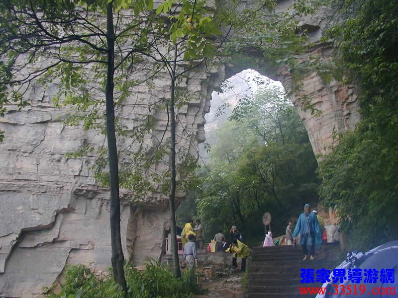 (南天門)大自然的造化真奇妙,利用一塊巨大的板狀石峰鑿出一扇大門,底寬10余米,高15米。相傳當(dāng)年屈原登天臺問天,就是從這里經(jīng)過的,故民間叫它“通天門”。據(jù)說向王天子在水繞四門苦練三年零六個(gè)月武藝,起事那天,就是立在這兒向皇宮連射三箭,流傳在武陵源民間的“三箭射皇宮”的典故就從此來。