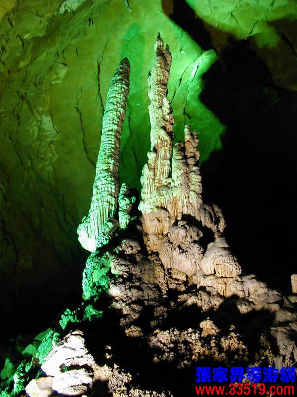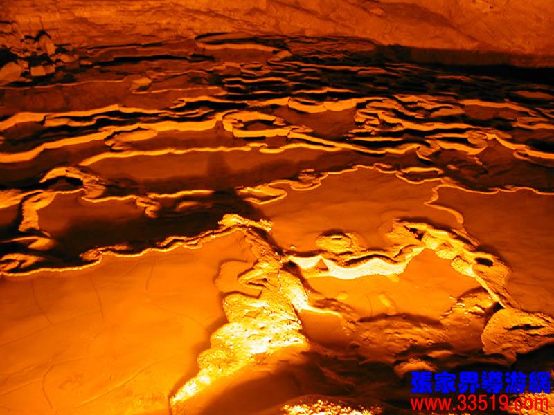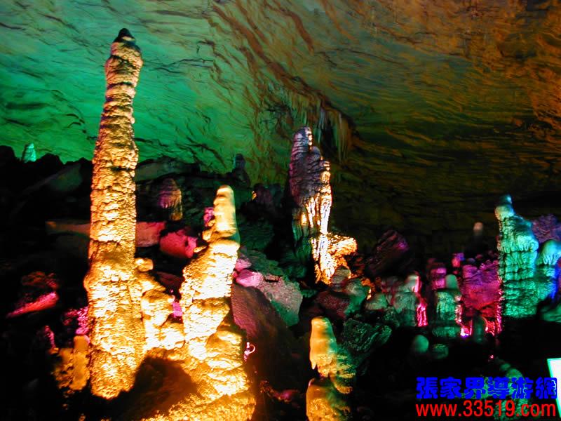 (龍宮)龍宮是黃龍洞十三個大廳中最大的一個,也是景色最美的景點(diǎn)之一,底面積15000平方米,平均高40米,兩千余根石筍拔地而起,千姿百態(tài),異彩紛呈,或如飛禽走獸,或如宮廷珍藏,有的像巍巍雪松,有的像火箭升空。龍宮后園有金銀兩座花池,清水常溢,花簇盛開。宮頂鐘乳柳垂簾掛,四周壁畫栩栩如生。溶解著各色各樣的礦物質(zhì)的水,從巖層中滲透出來,滴落下來。礦物質(zhì)在洞頂凝固結(jié)晶成倒懸鐘乳石,從鐘乳石滴落的水又把礦物質(zhì)澆疊、堆壘在洞底,而長成節(jié)節(jié)向上的石筍。大家看看這龍宮的造型,領(lǐng)略這磅礴的氣勢。洞內(nèi)最大石筍,高12米、直徑10米的漢白玉天然石椅“龍王寶座”居高臨下,眾多石柱石筍似人似物,維妙維肖,圍著寶座朝拜山呼,幾十座珊瑚亭亭玉立,儼然一支龐大的“宮廷樂隊(duì)”。湖南著名教授羊春秋先生作《寄生草》詞對此進(jìn)行描繪:“百態(tài)千姿模樣,三宮六院門巷。龍王開宴設(shè)瓊漿,猴王偷果鬧天堂,君王納寵擁羅帳。搬演了人間爭攘,匯集了天下奇觀。”