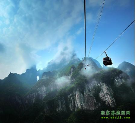 纜車從天門山主峰云夢仙頂至天門山寺前櫻桃灣廣場,總長度800,單程運(yùn)行約10分鐘,為無遮蓋的雙人吊椅式,是天門山山頂?shù)囊粭l絕佳空中觀景長廊。乘坐纜車緩緩飄行在林海之上,絕美的空中原始花園盡收眼底,白云裊裊,滿目碧翠,時有飛鳥在腳下掠過,時有樹梢花朵似探手可及。神仙般的瀟灑飄逸和無比的心曠神怡讓人流連忘返。