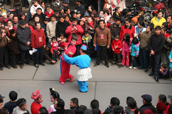 蚌殼用蔑扎骨架,蒙布或紙,外繪蚌紋,以紅綠綢鑲邊,內(nèi)貼水銀碎鏡片。由一旦一丑表演。旦扮蚌殼精,身背蚌殼,表演“扯四角”、“開蚌”、“戲水”、“整容”、“照鏡”、“戲翁”等動作,含蓄逗趣,活潑可愛。丑扮魚翁,手持撒網(wǎng),表演“踩水”、“窺蚌”、“戲蚌”等動作,詼諧風(fēng)趣。常令人捧腹。伴奏以弦樂為主,伴以竹笛,幽雅悅耳。