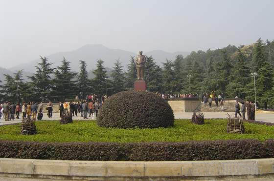 毛澤東銅像位于韶山沖的中心,紀(jì)念館、毛氏宗祠與韶山賓館之間。銅像區(qū)占地5200平方米,是經(jīng)中共中央批準(zhǔn)興建紀(jì)念毛澤東同志誕辰100周年的重點(diǎn)獻(xiàn)禮工程。這里原是一片沃野,地勢(shì)平坦開(kāi)闊,周?chē)荷焦白o(hù)。韶蜂在遠(yuǎn)處,高峻挺拔,云富坨大山巍峨雄壯,十八羅漢山逶迤綿長(zhǎng),黑石寨鐵骨錚錚。在山的襯托下,銅像更顯得氣勢(shì)磅礴。