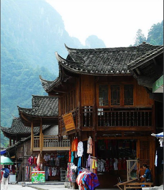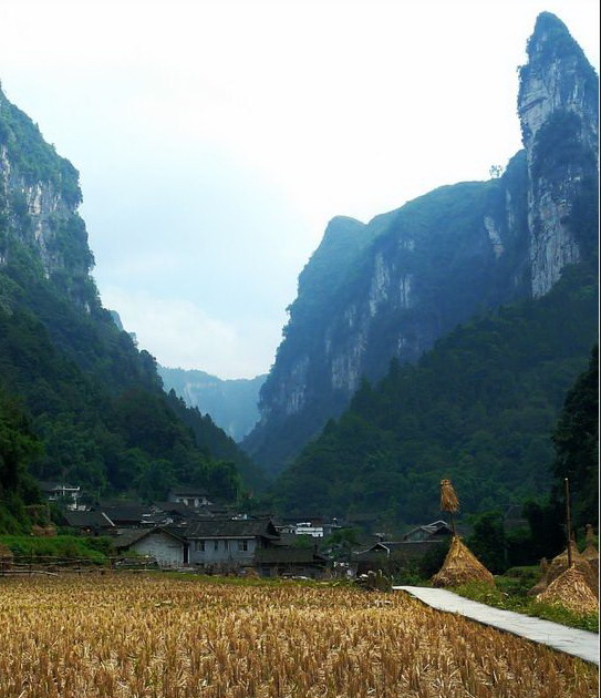 村寨四周山勢雄奇,絕壁夾天;“夯峽”、“九龍”、“玉泉”三溪在這里相會,如同三根彩帶在這里相交結(jié)。這里是風(fēng)景區(qū)的中心,一萬五千多米長的青石板路從這里一直通向各個景點這里還是一個角度十分好的觀景臺,人立于此,只要原地轉(zhuǎn)動身子,就可觀賞到東西南北全方位的各個景點,那含情脈脈的“相依巖”、昂首奮蹄的“駟馬峰”、惟妙惟肖的“孔雀開屏”五彩繽紛的“彩云壁”和“畫屏峰”……盡在眼中無不景象萬千,令人目不瑕接。詩人石元機(jī)贊曰: