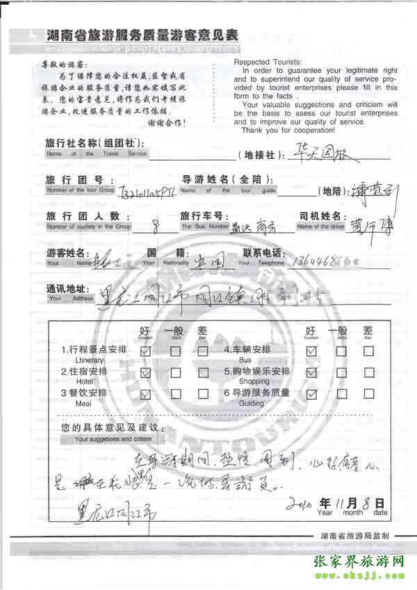 2010年11月8日黑龍江張先生一行8位旅游質量反饋:導游熱情周到,有孝心,是一流導游