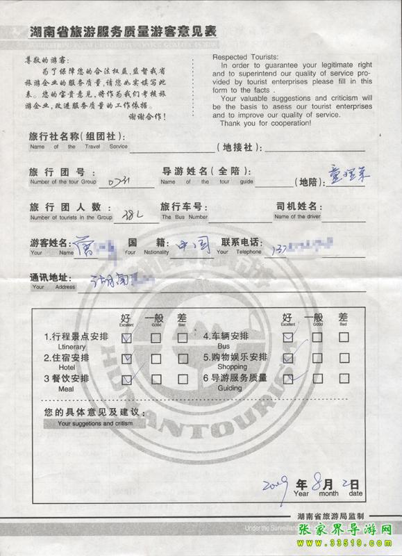 2009年7月31日湖南唐先生一行38人接待質(zhì)量反饋單: