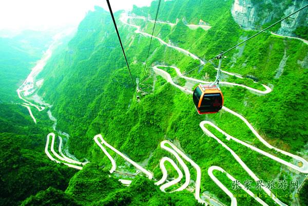 考慮到索道運行時間較長,高溫時游客們需要通風,每個轎廂專門設計了兩個通風窗,以形成空氣的對流,這人性化設計在國內是唯一的。索道鋼繩則來自于法國,直徑50.1mm,每米重達10kg,確保游客安全無虞。 天門山索道最大的亮點就是它的爬坡面支架的設計 ,這個支架共有壓索輪96個,托索輪16個,它綜合了現(xiàn)代物理學、現(xiàn)代工程學、現(xiàn)代制造業(yè)中最先進的理論和成果,應用了世界最先進的索道技術,從而使這段索道總給人一種蕩氣回腸、氣勢沖天的感覺。 天門山索道以張家界市中心的城市花園為起點,直達天門山頂的原始空中花園,猶如一道彩虹飛渡“人間” “天上”,又象一條巨龍騰翔素云蒼穹,依山籍壁,拔地沖天,蕩氣回腸,恢宏壯觀,成為天門山旅游風景區(qū)“四大奇觀”之一,為張家界這一世界級風景名勝區(qū)又添絕世奇景。